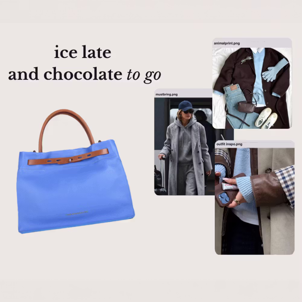 The bag we’ve chosen as ideal for travel reflects one of the most interesting trends of 2026—the combination of refreshing ice blue and calm brown that’s conquering the fashion runways.