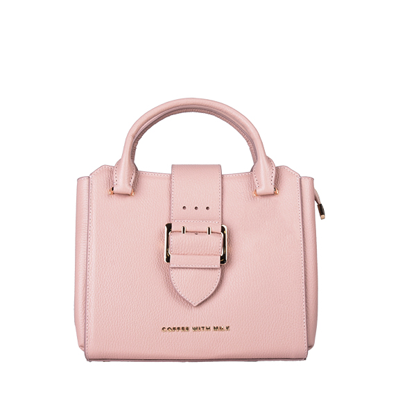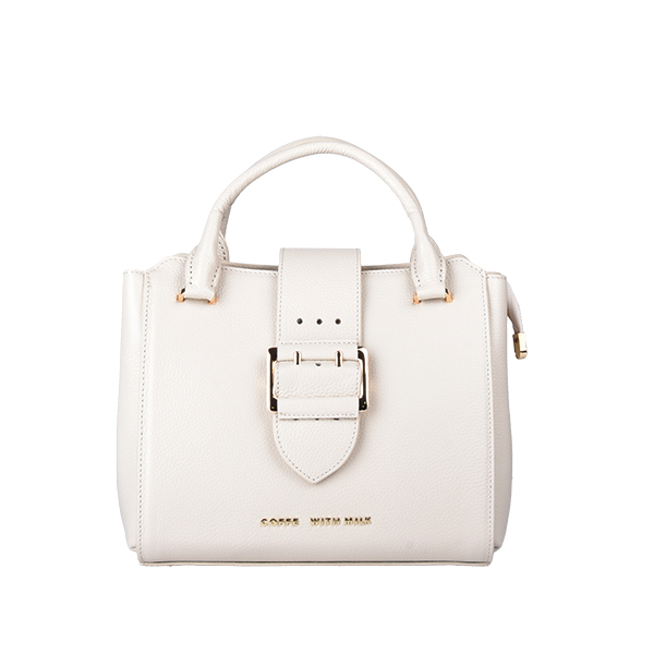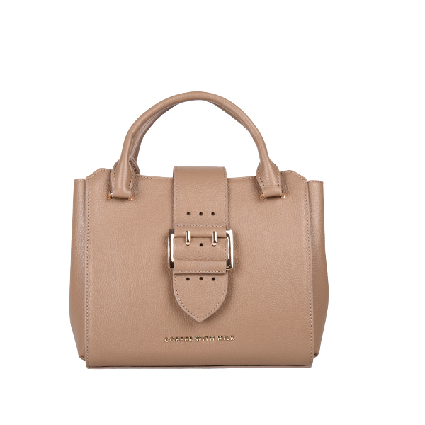 Coffee With Milk elegant women’s bag with a precise geometric shape and medium dimensions. Its exterior is defined by a compact form and classic design. The interior is spacious enough for your essentials, lined with fine smooth fabric, and divided into three compartments, the middle one secured with a metal zipper. Additionally, it features two hidden inner pockets. The bag closes at the top with a high-quality metal zipper and is further secured with a leather strap featuring an elegant metal buckle with a hidden magnetic button on the back. You can carry the bag in your hand or on your shoulder with two leather handles, or wear it crossbody thanks to the adjustable, detachable leather strap.