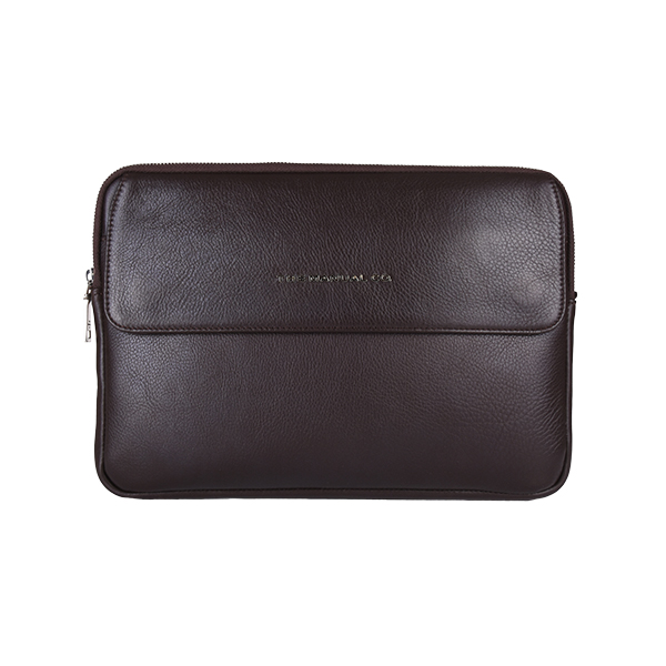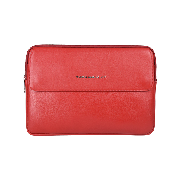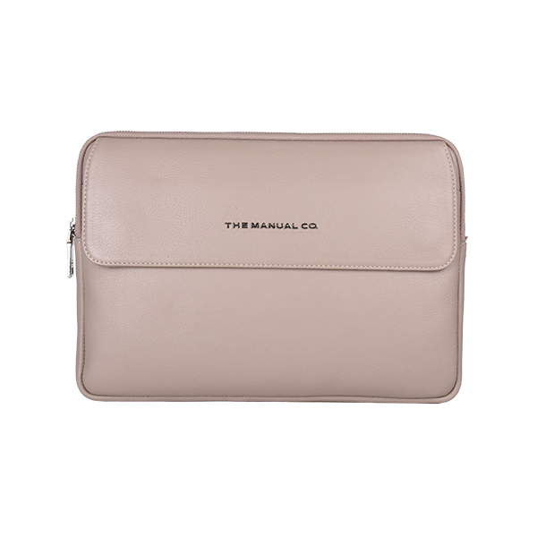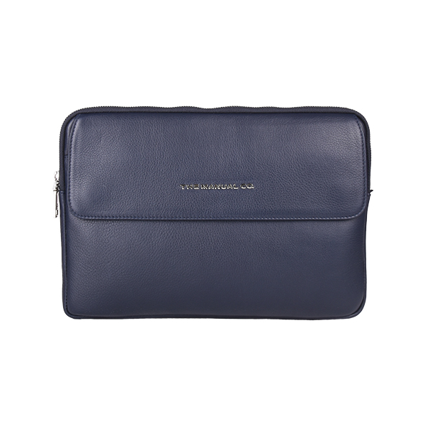 Manual leather laptop sleeve with a sleek, minimalist design and smaller dimensions. Its exterior is defined by clean geometry, rounded edges, and a refined, structured form. On the back, there is a leather strap that allows you to easily attach the sleeve to your suitcase trolley or carry it around your wrist. The interior is spacious enough for your tablet or laptop, lined with smooth fine fabric, and includes one hidden inner pocket. The sleeve closes at the top with a high-quality metal zipper, additionally secured with hidden magnetic buttons on the flap. It can be carried by hand or over the shoulder thanks to the adjustable, detachable cotton strap.