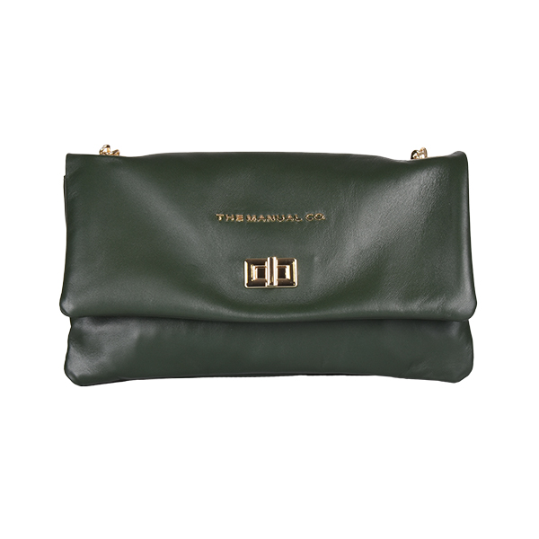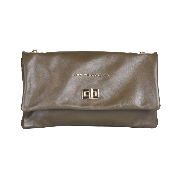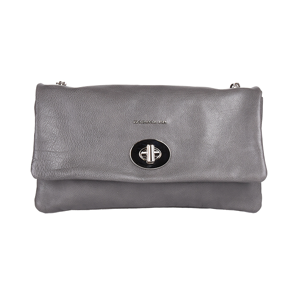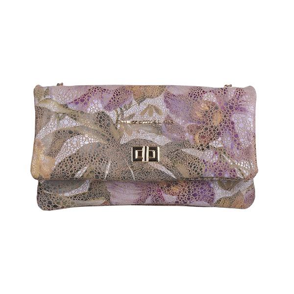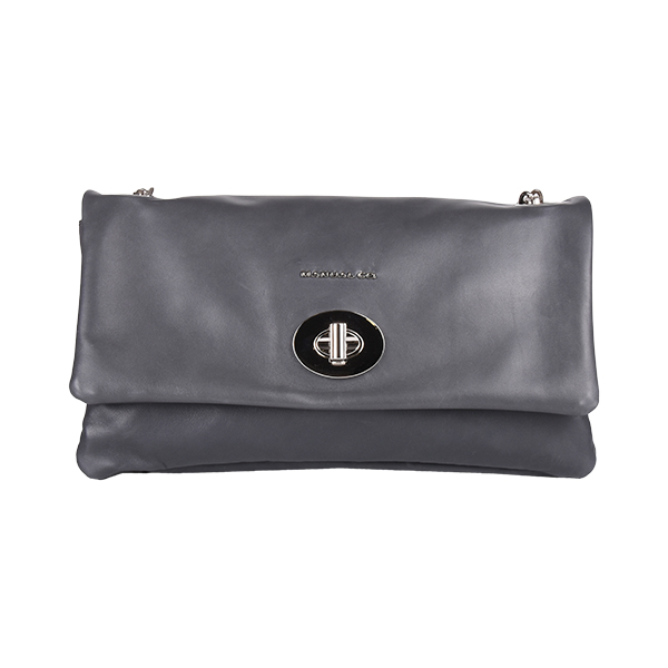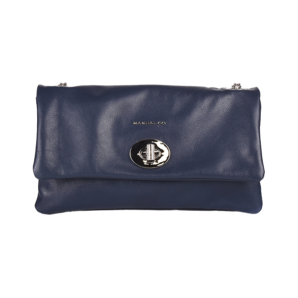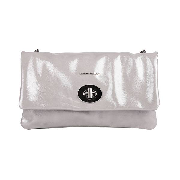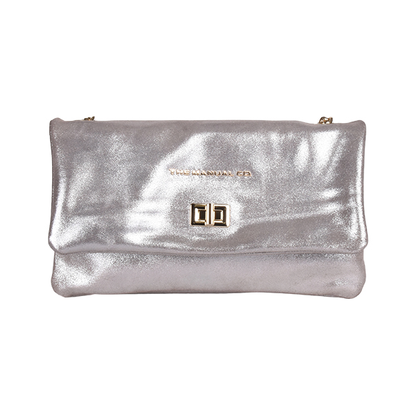 Manual elegant women’s folded bag with a long silver-tone chain strap for shoulder wear is created of soft leather. It buckles with a high-galvanized metal buckle. The back features one functional pocket that closes with a metal zip. Inside you will find two compartments while one closes with a zip too.