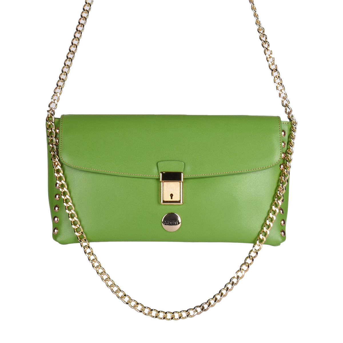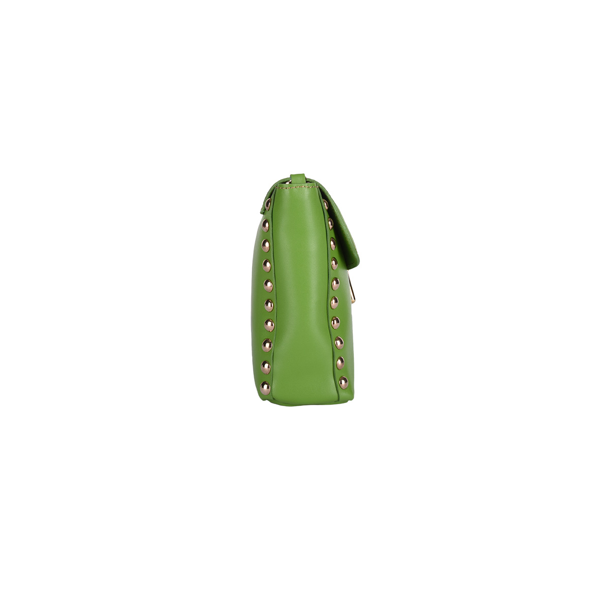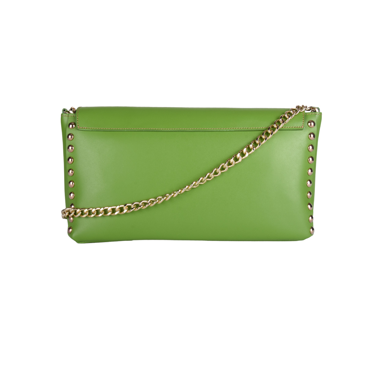 Coffee with milk women’s leather bag will immediately sweep you off your feet. The practicality and elegant touch come from two nickel-tone metal chains differing in length. The short one is perfect for hand wearing while the long one is for wearing it over the shoulder. What strikes you most are the metal studs, of the same colour as chains, equally applied to the bag’s edges.