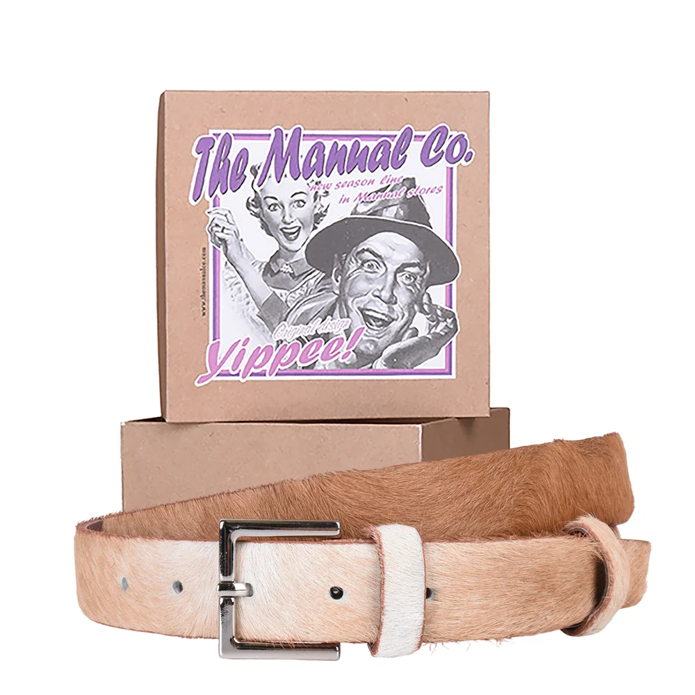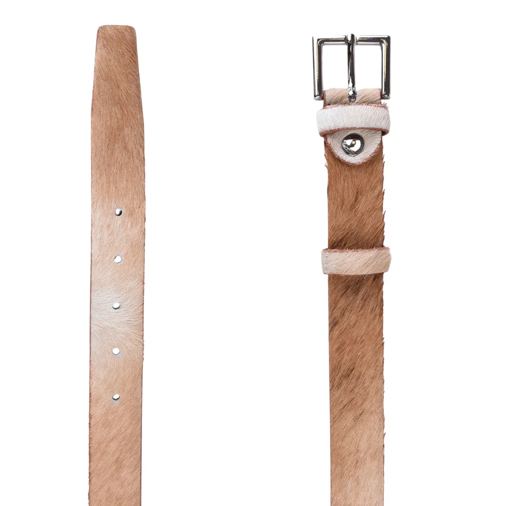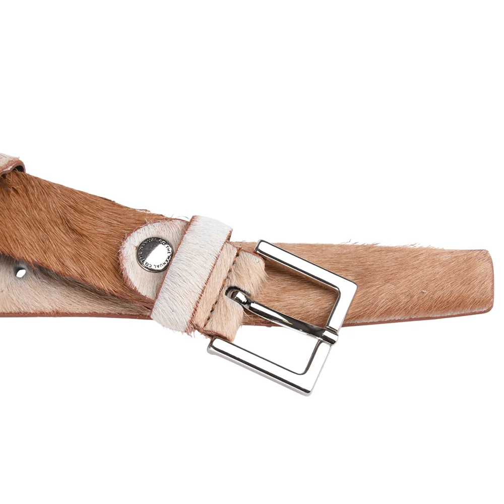 This elegant hair-on-hide belt is the perfect accessory to add texture and luxury to your everyday style. Crafted from high-quality natural cowhide, the belt features a beautiful mottled color that varies in shade, making every single piece unique. Inject a dose of natural glamour into your wardrobe with this unique belt. Order yours today and elevate your style!