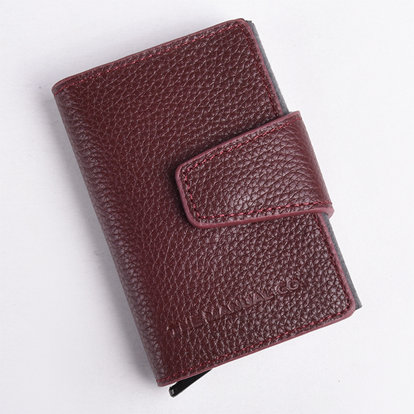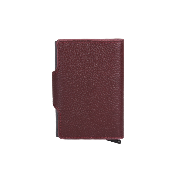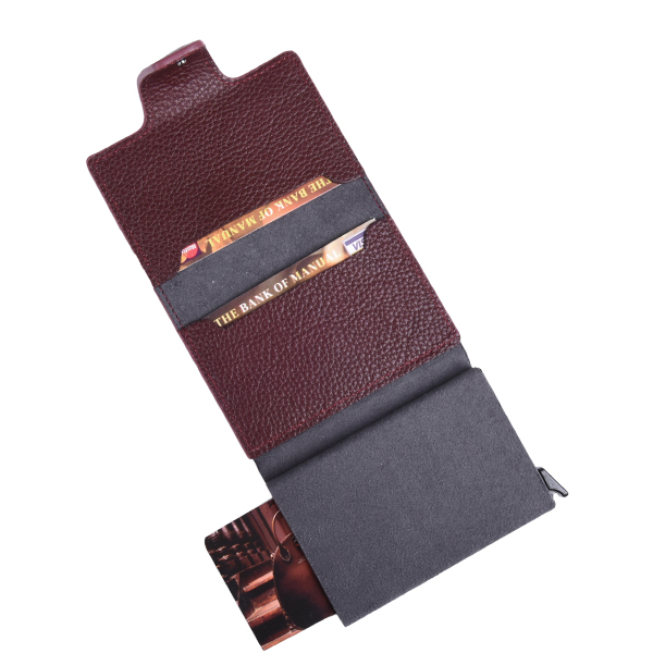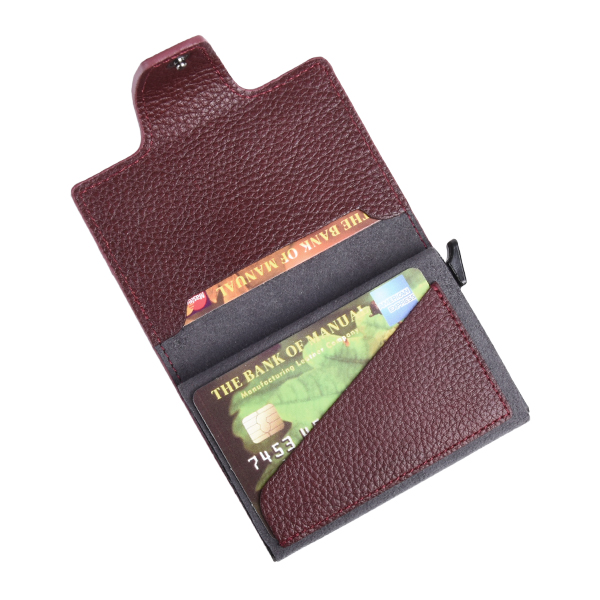 Manual card holder of simple, compact form and minimalist design. The exterior is defined by clean lines, outstanding functionality, and refined aesthetics. It features four compartments for credit cards or documents and a central section specially designed for an ID card or documents, which automatically slide out of the accessory at the push of a plastic lever. The holder closes by folding and is additionally secured with a leather strap featuring a hidden magnetic button.