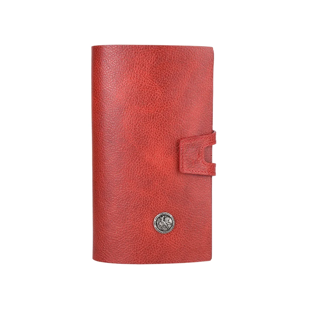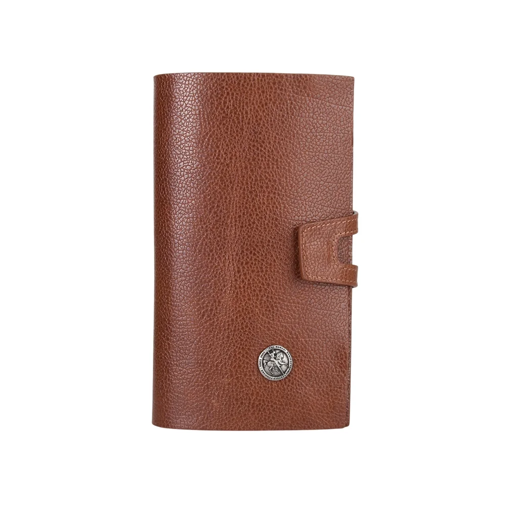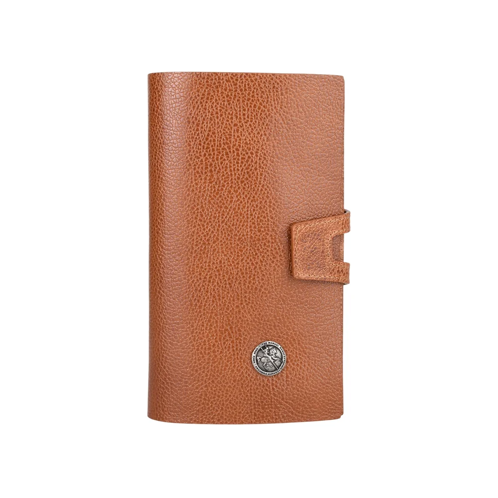 Kožni novčanik jasnih linija. Ima preko 20 džepića za kartice i dovoljno prostora za papirni novac. Ukrašen je The Manual Co. logom sa konjanikom na prednjoj strani i zatvara se pomoću kopče.