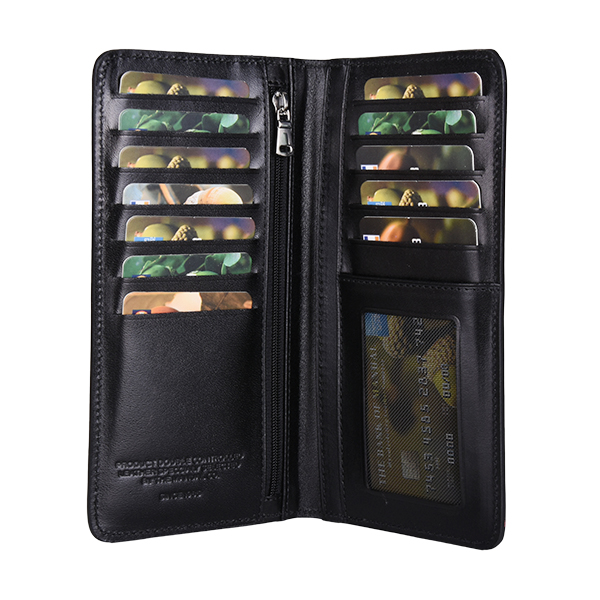Unutrašnjost je podeljena u 13 pregrada za kreditne kartice i lična dokumenta, jedan skriveni džep za sitan novac i dva skrivena džepa za papirne apoene. Aksesoar se zatvara kvalitetnim metalnim cibzarom.