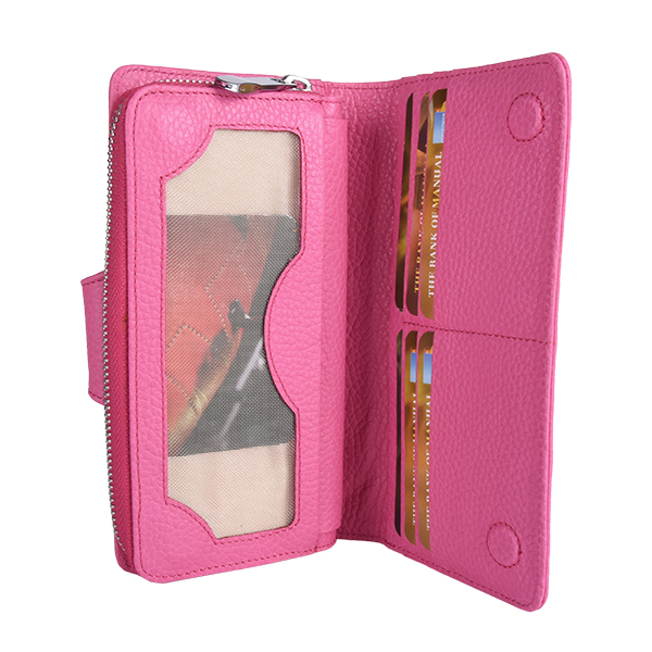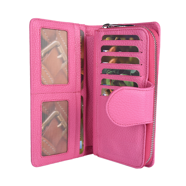 Manual ženski kožni novčanik spaja funkcionalnost, kvalitet i estetiku u jedan aksesoar klasičnog dizajna. Spoljašnošću dominiraju jednostavne linije i minimalizam dok je unutrašnjost odlično organizovana podeljena u tri odvojena odeljka različitih namena: jedan sa 8 proreza za kreditne kartice i dokumenta i dve transparentne pregrade, drugi sa 8 proreza za kreditne kartice i jednom velikom transparentnom pregradom i središnji odeljak sa tri pregrade za novčanice i sitan novac koja je obezbeđena metalnim cibzarom. Odeljci za krediten kartice se zatvaraju skrivenim magnetnima dok se sam aksesoar zatvara preklapanjem pomoću kožnog kaiša sa metalnim drikerom.