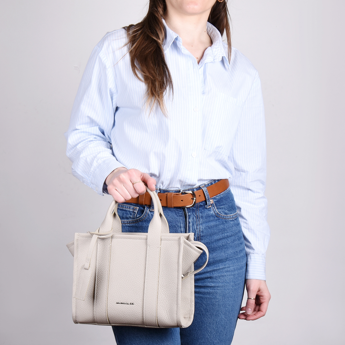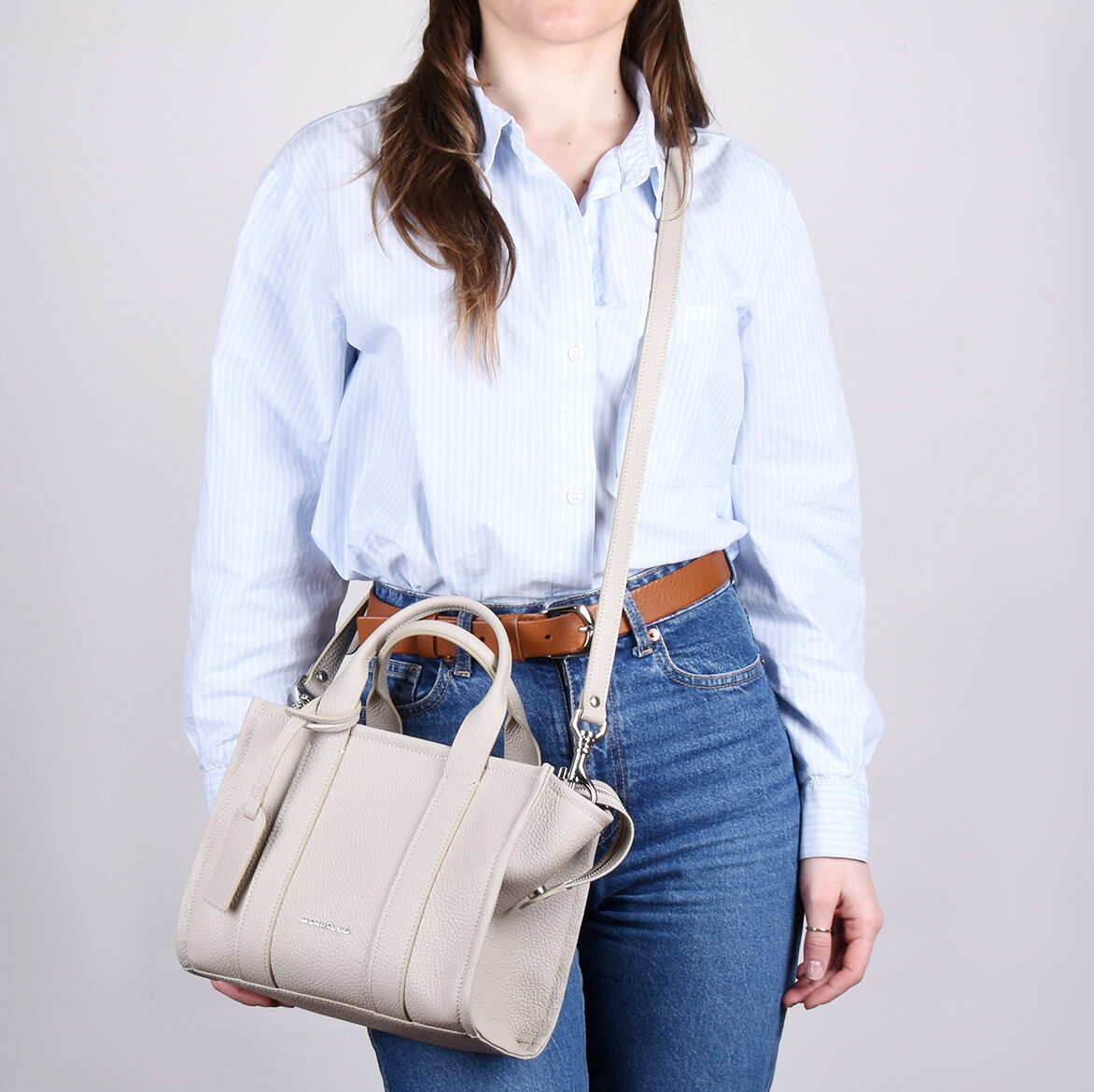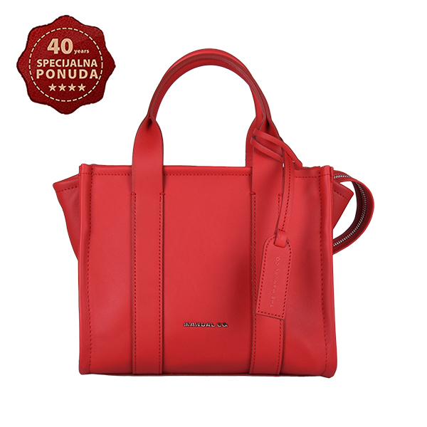 Manual elegantna ženska torba pravilne geometrijske forme, srednjih dimenzija. Spoljašnošću dominira kompaktna forma i klasičan dizajn. Unutrašnjost je dovoljno prostrana za Vaše sitnice, postavljena je finim glatkim materijalom i poseduje dve unutrašnje skrivene pregrade, od kojih je jedna obezbeđena kvalitetnim metalnim cibzarom. Torba se zatvara pri vrhu pomoću kvalitetnog metalnog cibzara, a možete je nositi u ruci ili na ramenu pomoću dve kožne ručke ili preko ramena zahvaljujući podesivom, zamenjivom kožnom kaišu.