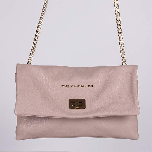 Eelegantna ženska torbica na preklop sa dugačkim lancem u boji sreba za nošenje preko ramena, izrađena je od mekane kože. Zakopčava se jednom visoko poliranom galvanizovanom metalnom kopčom. Na poleđini se nalazi jedan funkcionalan džep koji se zakopčava sa metalnim cibzarom. U unutrašnjosti torbe se nalaze dve pregrade od kojih se jedna takođe zakopčava sa cibzarom.
