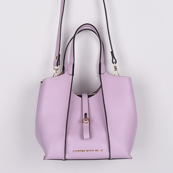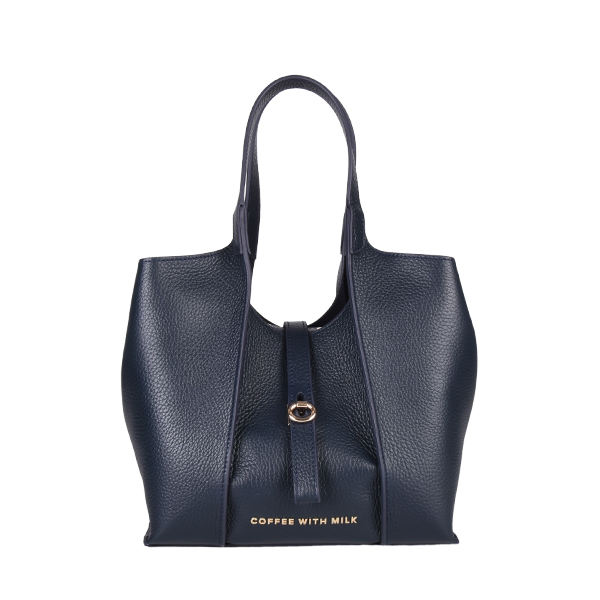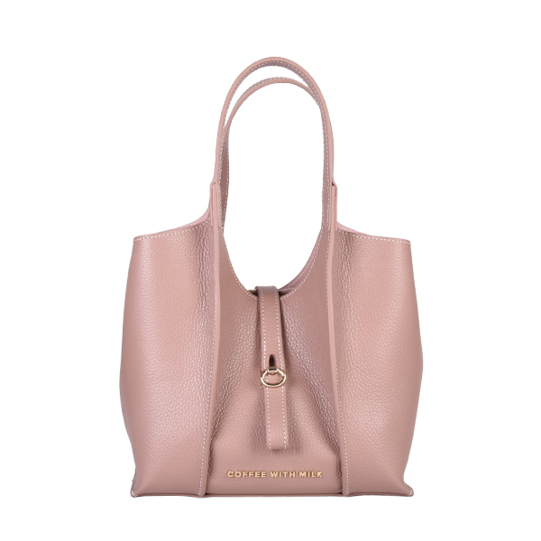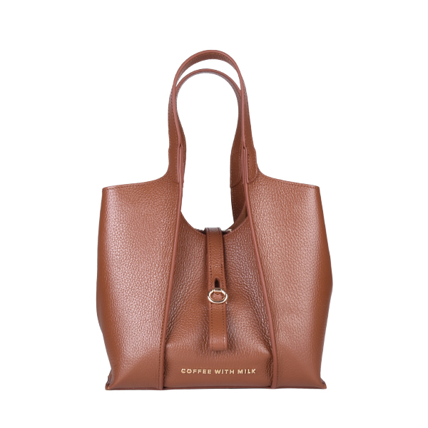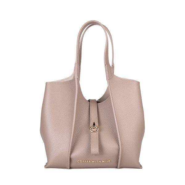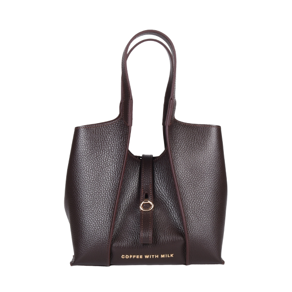 Coffee With Milk elegantna ženska torba neobične geometrijske forme sa brojnim detaljima i savremenim dizajnom. Unutrašnjost je dovoljno prostrana za Vaše dragocenosti, poseduje tanak kožni kaiš koji drži formu torbe i služi za zatvaranje. Torba poseduje i dodatni, zamenjivi kožni neseser sa metalnim cibzarom. Torba se zatvara pomoću elegantne metalne kopče a možete je nositi u ruci ili preko ramena zahvaljujući kožnim ručkama.